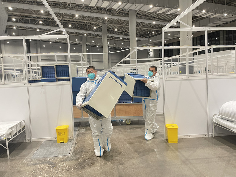 10月3日,綜合管理部副部長(zhǎng)胡夢(mèng)園接到了援建敕勒川方艙醫(yī)院2號(hào)廳的任務(wù)后,迅速聯(lián)系供應(yīng)商,及時(shí)采購了供暖所需的風(fēng)炮機(jī)等相關(guān)設(shè)備并組織員工黃彬、張文斌、王波、閆慶光、賈延、杜志敏到達(dá)現(xiàn)場(chǎng),掛暖風(fēng)機(jī)、安裝熱風(fēng)炮、搬運(yùn)暖風(fēng)空調(diào)……一直干到凌晨3點(diǎn)多。僅僅休息了半天,他們又接到了援建敕勒川方艙醫(yī)院1號(hào)廳的任務(wù),并且所有物資都需要公司自己解決,胡夢(mèng)園自己也記不清接打了多少通電話聯(lián)系貨源,但他的辛苦沒有白下,當(dāng)天晚上6點(diǎn),55臺(tái)暖風(fēng)機(jī)、10臺(tái)熱風(fēng)炮、20臺(tái)暖風(fēng)空調(diào)等所需物資全部運(yùn)送到位,現(xiàn)場(chǎng)待命的黃彬、張文斌、閆慶光、賈延、杜志敏當(dāng)起了搬運(yùn)工、安裝工,協(xié)助施工人員進(jìn)行設(shè)備的拉運(yùn)和安裝,回到住處已經(jīng)是凌晨的2點(diǎn)多?!皝砦?guī)湍阆麣⒁幌?,我?guī)湍愦魇痔住薄翱斐脽岢园?,今天天氣冷,食堂給你們做了胡辣湯,暖和暖和身體?!敝髱滋欤C合管理部的員工們又承擔(dān)起了為施工人員提供后勤保障的任務(wù)。消殺、發(fā)放隔離服、送飯……他們細(xì)致周到、無微不至的服務(wù),為公司施工隊(duì)伍順利完成援建方艙醫(yī)院施工任務(wù)聚起了高效的合力。